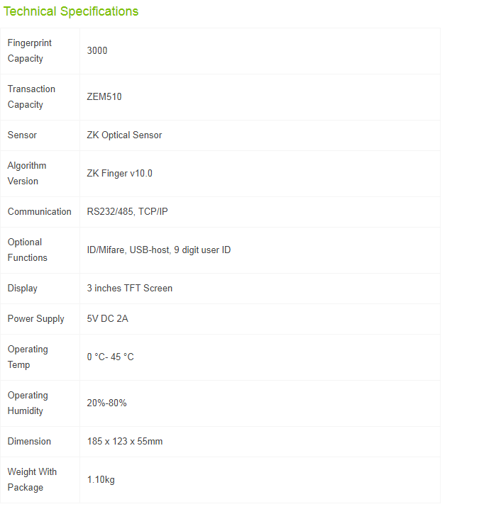 سعة البصمات : 3000 بصمه / سعة الكروت : 10000 كارت