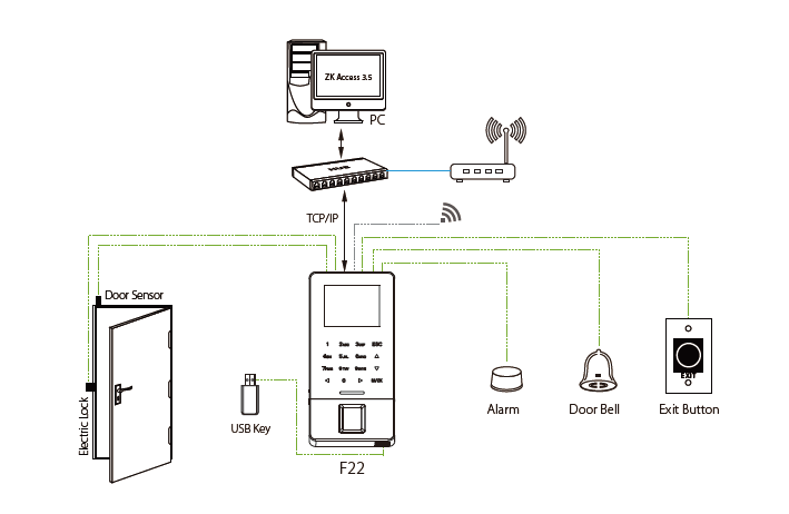 توفر F22 تجربة لمس فائقة مع لوحة مفاتيح تعمل باللمس ، وتوفر المرونة للتثبيت المستقل أو مع أي لوحة تحكم للدخول من جهة خارجية تدعم إشارة قياسية من wiegand. كما يتوفر TCP / IP و RS485 و Wi-Fi بحيث يمكن استخدام الجهاز في شبكات مختلفة.